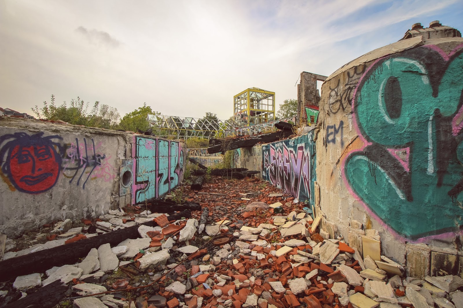 Encore une fois je suis paniquée à l'idée de pénétrer dans ce lieu, ou plutôt de pas pouvoir y entrer. Visiblement ça aurait du être le cadet de mes soucis ! Un homme nous fait un signe bière à la main, on dirait qu'on peut y aller sans problème. Y a déjà du monde, des ados de 15 ans qui traînent et des anglais qui déplorent l'état de l’endroit, en effet beaucoup plus cool avant l’incendie qui à ravagé le complexe. Moi je suis aux anges et je n'ai aucune envie de repartir ! Par contre c'est l'endroit le plus dangereux que j'ai pu visiter, des clous rouillés géants partout au sol et le tout est très instable. Les allemands eux ont l'air d'avoir l'habitude et ça ne leur fait pas spécialement peur. Nous on se méfie... J'ai même fait un peu d'escalade pour avoir une vue d'ensemble, mon dieu j'ai jamais eu autant le vertige de ma vie...